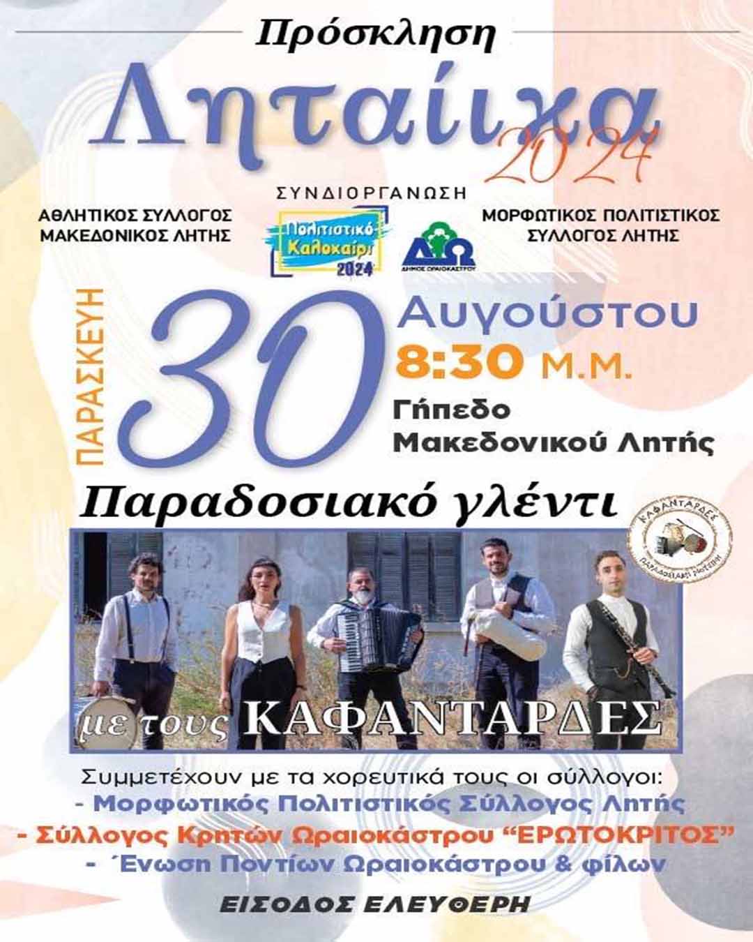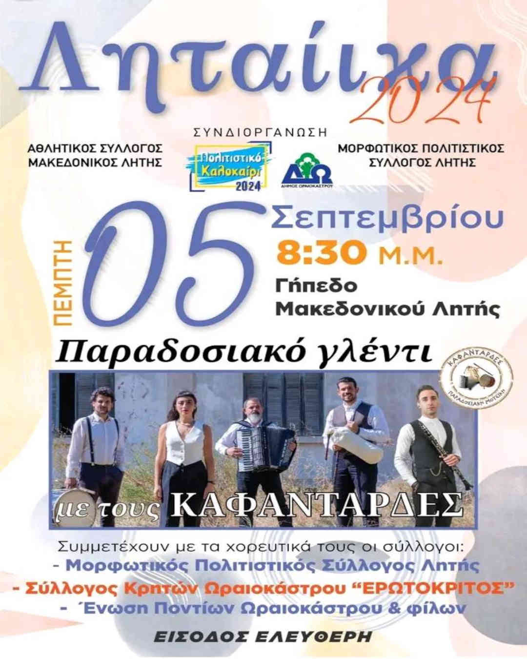 Σας περιμένουμε την Παρασκευή 30 Αυγούστου 2024 και ώρα 8:30 μμ στο γήπεδο του Μακεδονικού Λητής για ένα παραδοσιακό γλέντι με τους ΚΑΦΑΝΤΑΡΔΕΣ.