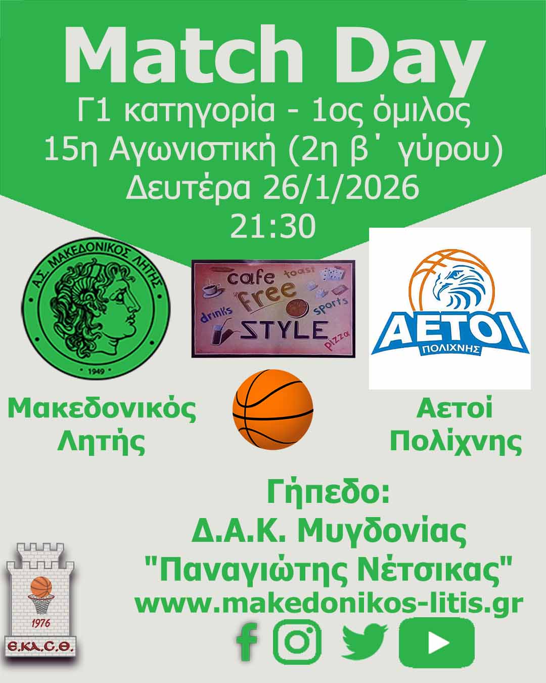 Υποδεχόμαστε τους Αετούς Πολίχνης, ομάδα που βρίσκεται στην 2η θέση της βαθμολογίας και θέλουμε την νίκη για να παραμείνουμε στις πρώτες θέσεις της βαθμολογίας.