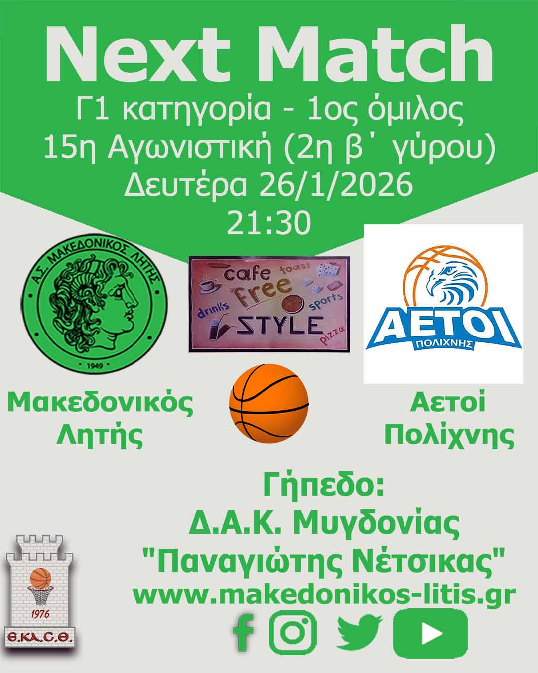 Αύριο Δευτέρα 26/1 η ομάδα μας φιλοξενεί τους Αετούς Πολίχνης, ομάδα που βρίσκεται στην 2η θέση της βαθμολογίας. Η ομάδα μας θέλει να αφήσει πίσω της το άδικο αποτέλεσμα του προηγούμενου αγώνα και να επιστρέψει στις νίκες.