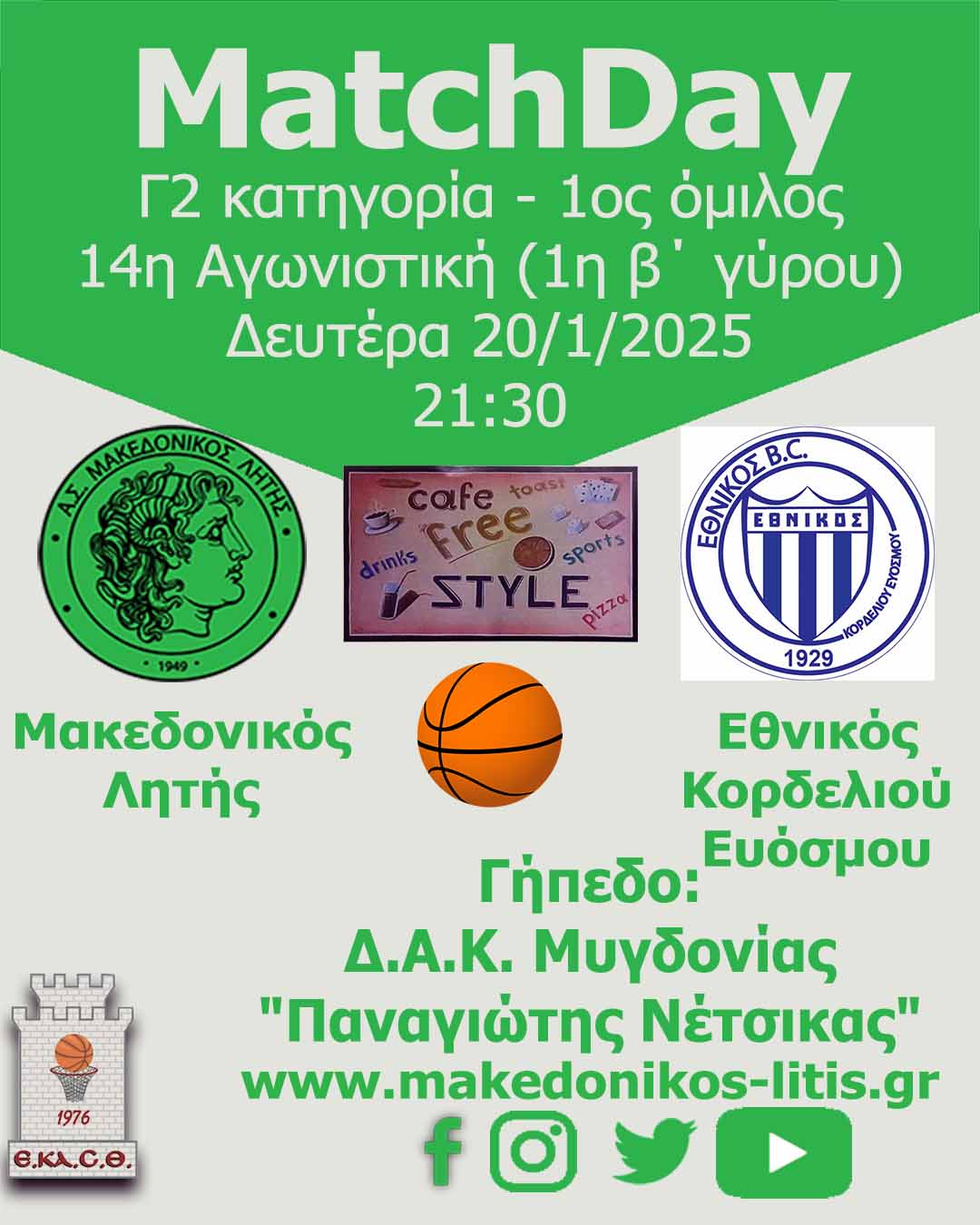 Πρώτος αγώνας για τον δεύτερο γύρο του πρωταθλήματος. Δέκατη τέταρτη αγωνιστική του πρωταθλήματος...αντίπαλός μας ο Εθνικός Κορδελιού Ευόσμου, ομάδα με την οποία ισοβαθμούμε στην πρώτη θέση. Στόχος η νίκη...