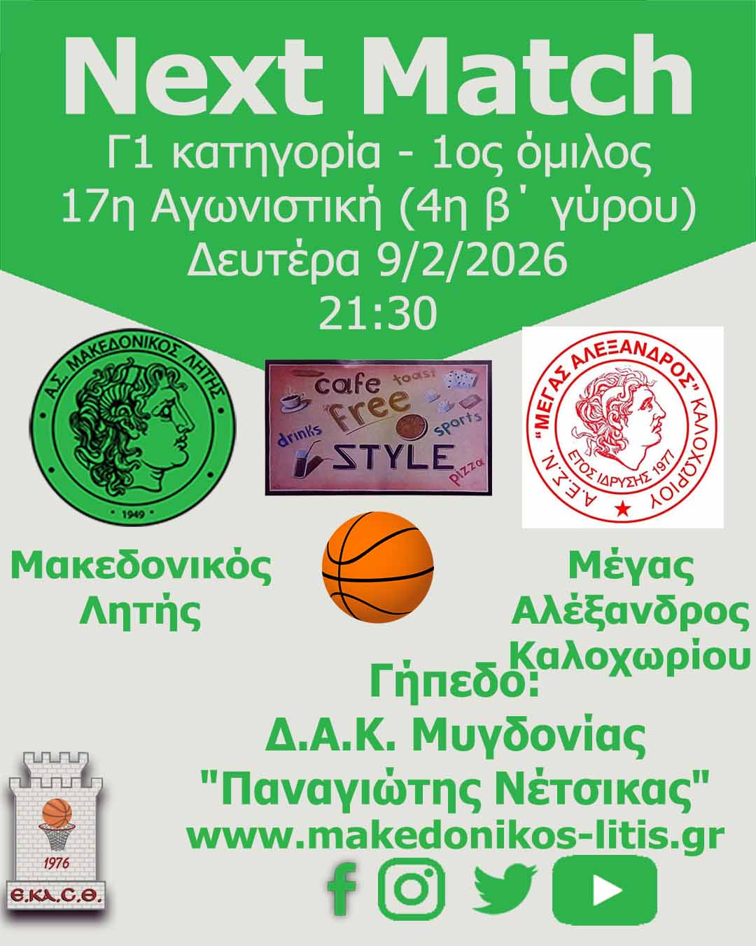 Αύριο Δευτέρα 9/2 η ομάδα μας φιλοξενεί τον 4ο στην βαθμολογία Μέγα Αλέξανδρο Καλοχωρίου σε έναν πολύ κρίσιμο αγώνα. Με νίκη η ομάδα μας παραμένει στην πρώτη πεντάδα της βαθμολογίας που της δίνει την δυνατότητα συμμετοχής στα play off ανόδου.