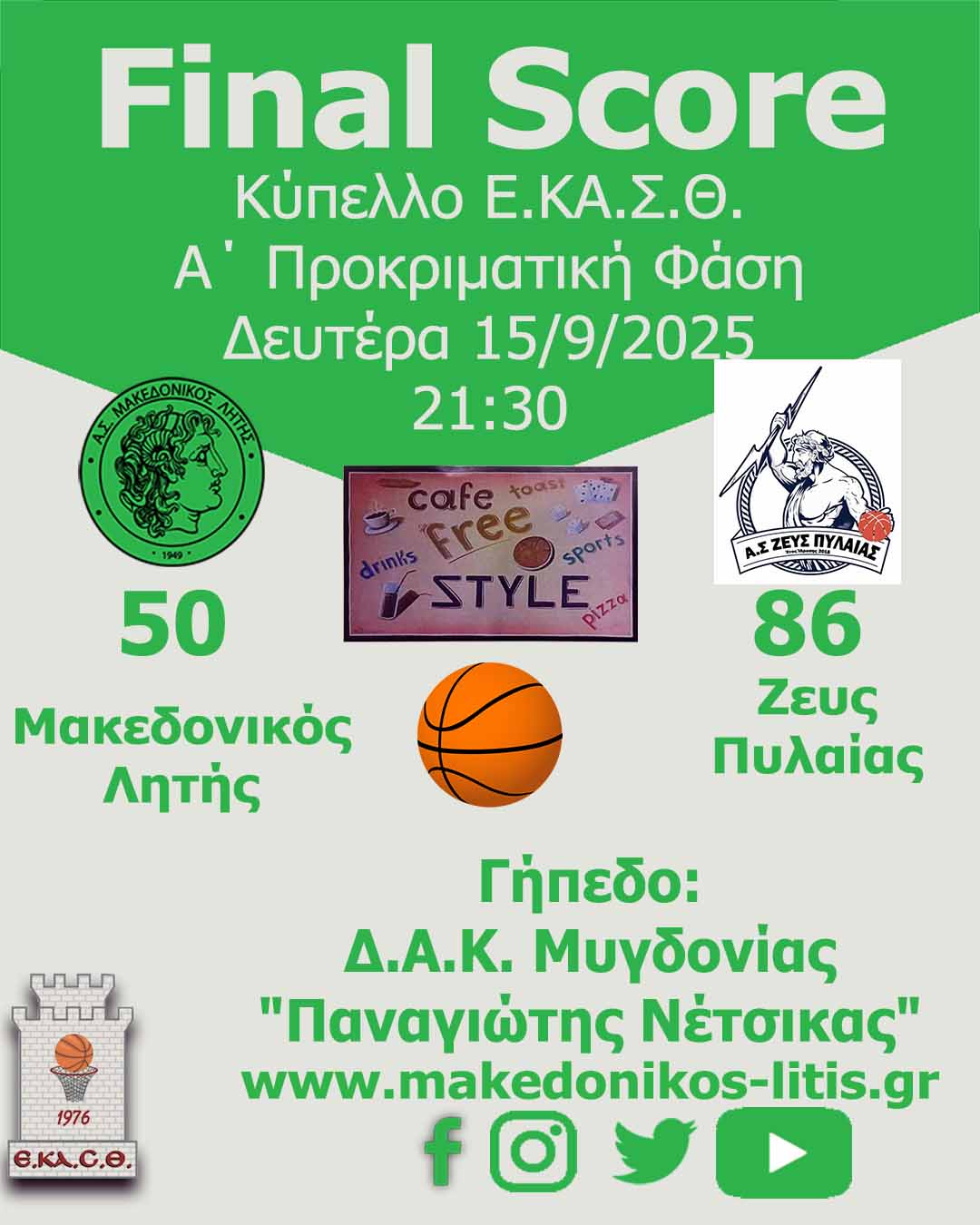 🏀 Αποκλείστηκε από το κύπελλο Ε.ΚΑ.Σ.Θ. η ομάδα μας μετά την ήττα με σκορ 50-86 από τον Ζευς Πυλαίας.