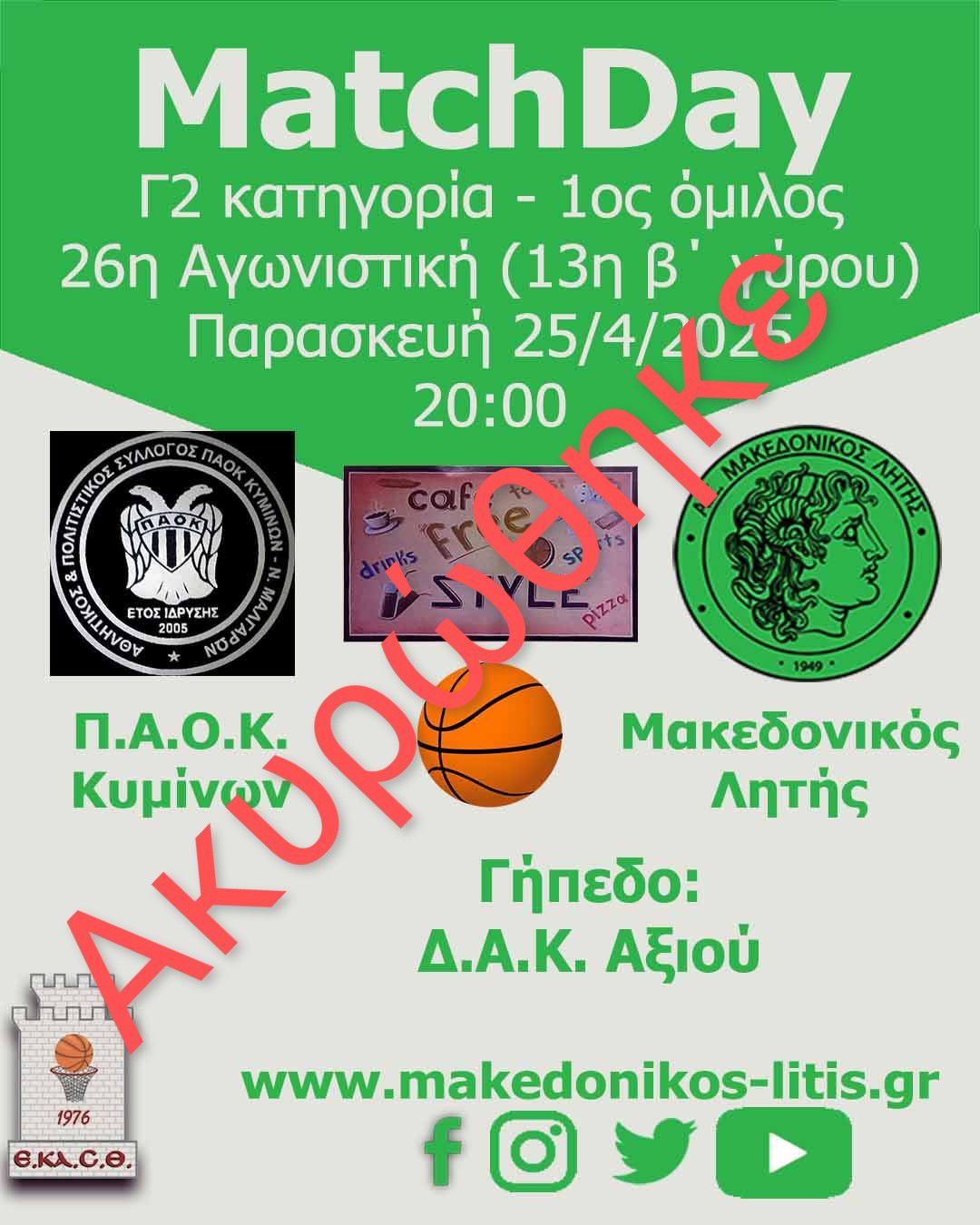 🏀 Ενημερώνουμε τους φίλους μας ότι ο σημερινός αγώνας στην έδρα του ΠΑΟΚ Κυμίνων ακυρώθηκε και θα κατοχυρωθεί υπέρ της ομάδας μας.