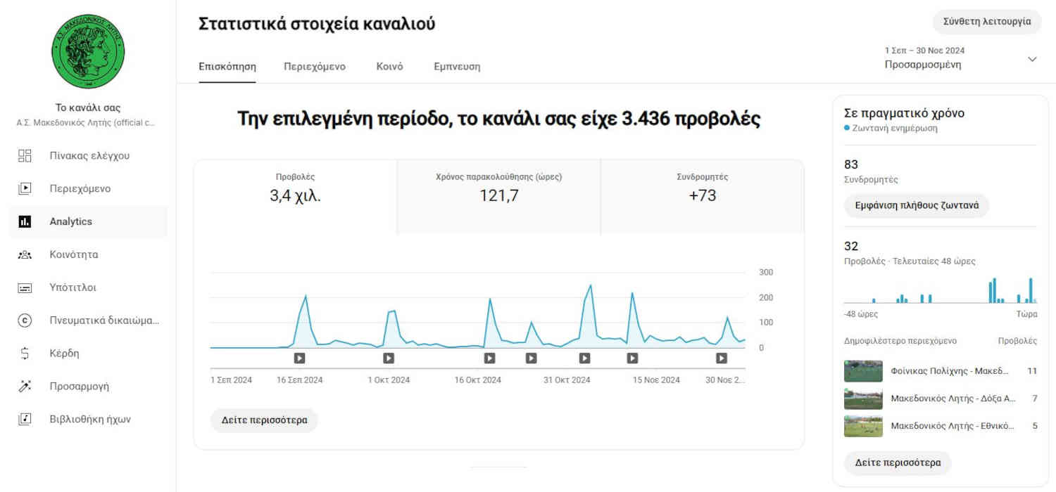 Κατά το χρονικό διάστημα 1/9/2024 - 30/11/2024, το κανάλι μας στο YouTube είχε 3.436 προβολές.