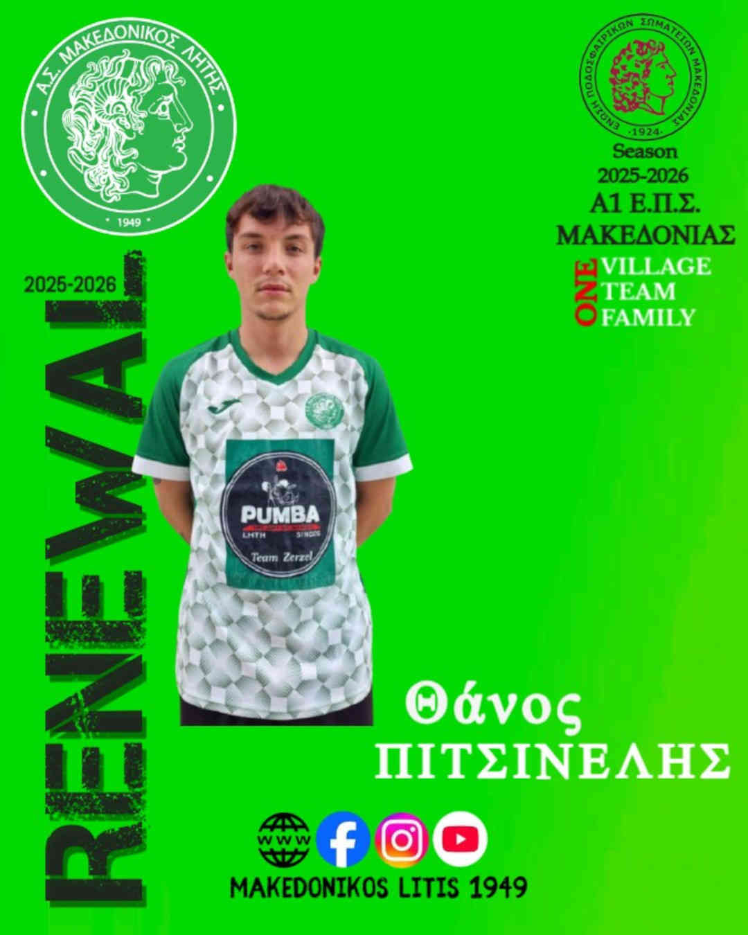 Η ομάδα μας ανακοινώνει την ανανέωση της συνεργασίας με τον 20χρονο πλάγιο χαφ Θάνο Πιτσινέλη και του ευχόμαστε μια γεμάτη σεζόν χωρίς τραυματισμούς και πολλές νίκες.