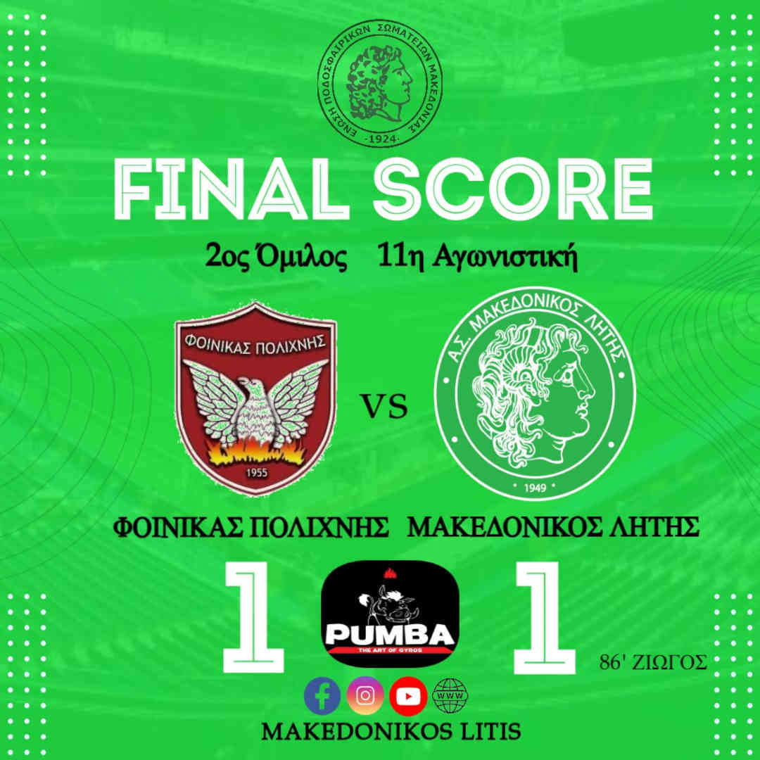 Ισόπαλο με σκορ 1-1 έληξε το εκτός έδρας ντέρμπι της 11ης αγωνιστικής για την ομάδα μας με αντίπαλο τον Φοίνικα Πολίχνης, παραμένοντας σε απόσταση βολής από την κορυφή.