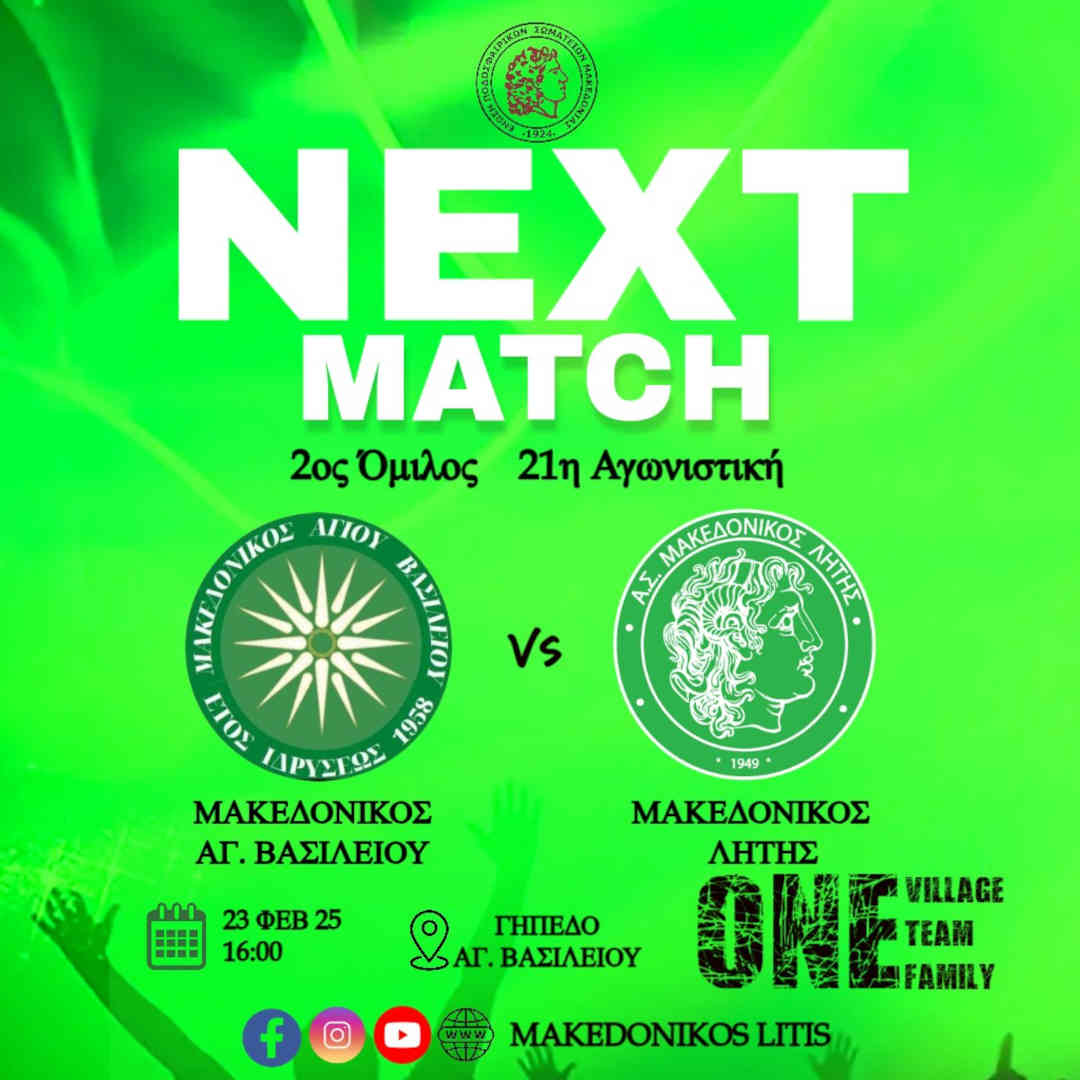 Την Κυριακή 23/2, η ομάδα μας φιλοξενείται από τον Μακεδονικό Αγίου Βασιλείου για την 21η αγωνιστική του πρωταθλήματος