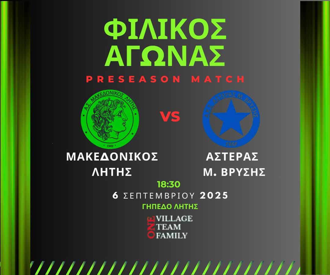 Τελευταίο φιλικό παιχνίδι για την ομάδα μας, με αντίπαλο την ομάδα του Αστέρα Μ. Βρύσης, μια βδομάδα πριν την πρεμιέρα του πρωταθλήματος όπου θα υποδεχθούμε στην έδρα μας την ομάδα της Α.Ε. Πυλαίας.