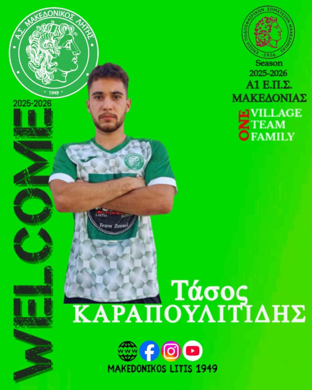 Έκτο μεταγραφικό απόκτημα για την ομάδα μας ο 21χρονος αμυντικός μέσος Τάσος Καραπουλιτίδης, μέχρι πρότινος ποδοσφαιριστής του Π.Ο. Νέας Καλλικράτειας