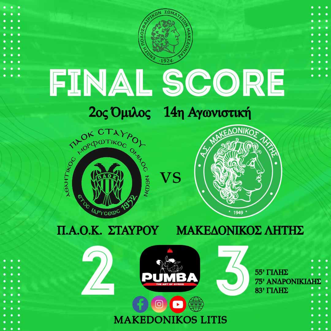 Με νίκη έκλεισε τις υποχρεώσεις της για το 2024 η ομάδα μας, επικρατώντας εκτός έδρας του ΠΑΟΚ Σταυρού με σκορ 2-3, με σκόρερ τους Ανδρονικίδη και Γίλη.