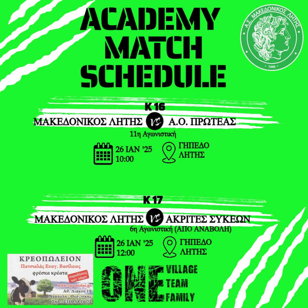 Περισσότερα: ⚽️ Κ17 Μακεδονικός Λητής - Ακρίτες Συκεών, Κ16 Μακεδονικός Λητής - Πρωτέας Ευόσμου